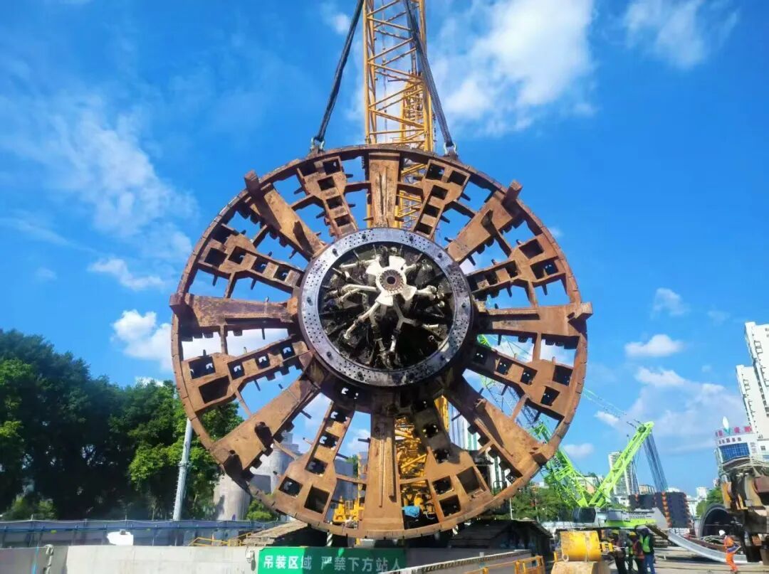 ▲“粤东城际1号”刀盘吊装下井